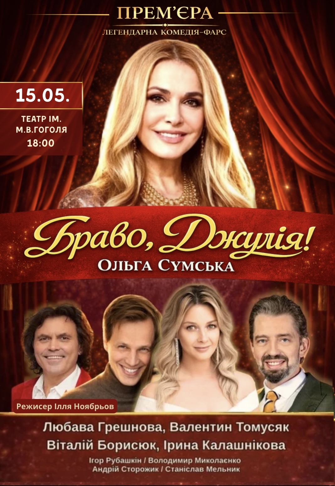 Спектакль "Браво, Джулия!". Премьера! состоится 15 мая 2026, 18:00, пятница в Академический областной музыкально-драматический театр им. Н.В. Гоголя. С помощью сервиса internet-bilet.ua, Вы сможете с легкостью забронировать, заказать и купить билеты на интересующий Вас концерт, спектакль, оперу, балет, мастер-классы, спортивные и детские мероприятия, оплатив их самым удобным для Вас способом: через интернет банковской картой VISA/MasterCard, наличными или курьером, если сделаете заказ билета c доставкой.