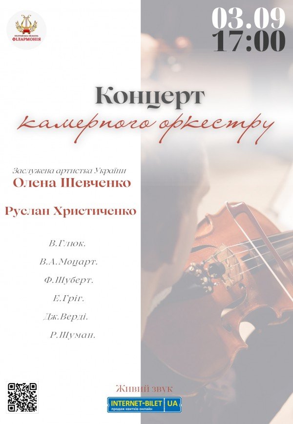 Концерт камерного оркестра состоится 3 сентября 2023, 17:00, воскресенье в Полтавская областная филармония. С помощью сервиса internet-bilet.ua, Вы сможете с легкостью забронировать, заказать и купить билеты на интересующий Вас концерт, спектакль, оперу, балет, мастер-классы, спортивные и детские мероприятия, оплатив их самым удобным для Вас способом: через интернет банковской картой VISA/MasterCard, наличными или курьером, если сделаете заказ билета c доставкой.
