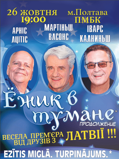 Ёжик в тумане состоится 26 октября 2016, 19:00, среда в ЦКД Полтавской городской территориальной общины (ГДК). С помощью сервиса internet-bilet.ua, Вы сможете с легкостью забронировать, заказать и купить билеты на интересующий Вас концерт, спектакль, оперу, балет, мастер-классы, спортивные и детские мероприятия, оплатив их самым удобным для Вас способом: через интернет банковской картой VISA/MasterCard, наличными или курьером, если сделаете заказ билета c доставкой.