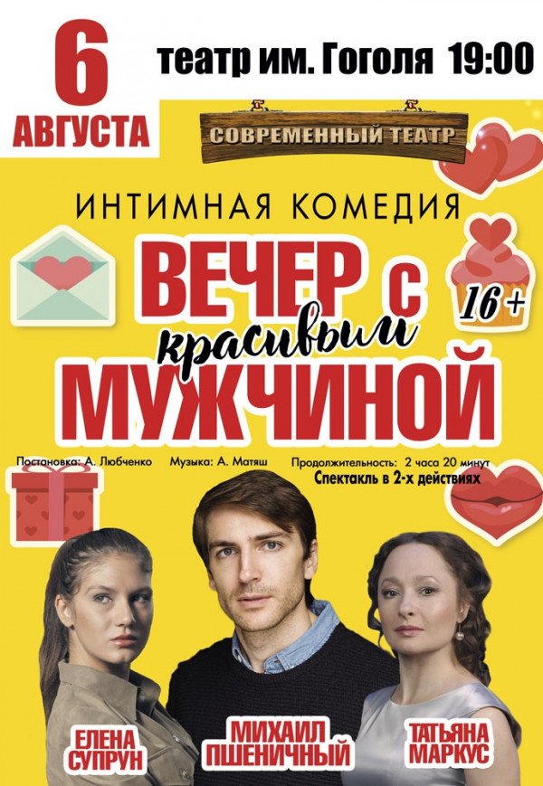 Интимная комедия "Вечер с красивым мужчиной" состоится 6 августа 2018, 19:00, понедельник в Академический областной музыкально-драматический театр им. Н.В. Гоголя. С помощью сервиса internet-bilet.ua, Вы сможете с легкостью забронировать, заказать и купить билеты на интересующий Вас концерт, спектакль, оперу, балет, мастер-классы, спортивные и детские мероприятия, оплатив их самым удобным для Вас способом: через интернет банковской картой VISA/MasterCard, наличными или курьером, если сделаете заказ билета c доставкой.