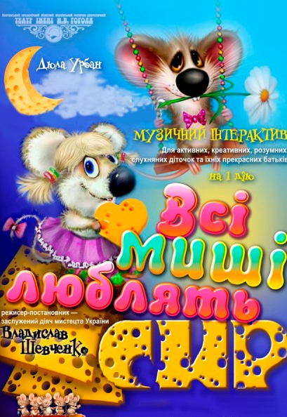 Спектакль "Все мыши любят сыр" состоится 15 февраля 2026, 12:00, воскресенье в Академический областной музыкально-драматический театр им. Н.В. Гоголя. С помощью сервиса internet-bilet.ua, Вы сможете с легкостью забронировать, заказать и купить билеты на интересующий Вас концерт, спектакль, оперу, балет, мастер-классы, спортивные и детские мероприятия, оплатив их самым удобным для Вас способом: через интернет банковской картой VISA/MasterCard, наличными или курьером, если сделаете заказ билета c доставкой.