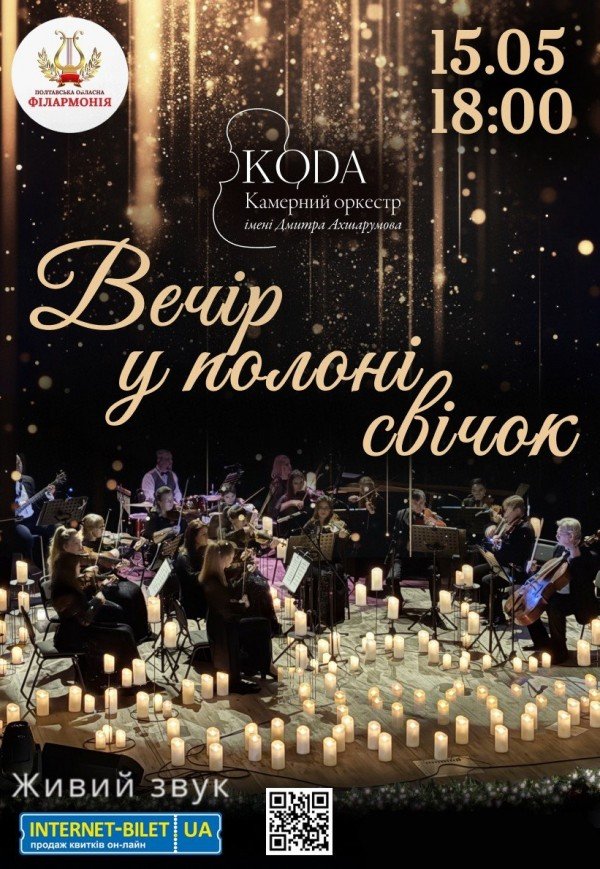 Концерт "Вечір у полоні свічок" відбудеться 15 травня 2026, 18:00, п’ятниця в Полтавська обласна філармонія. За допомогою сервісу internet-bilet.ua, Ви зможете з легкістю забронювати, замовити та купити квитки на концерт, спектакль, оперу, балет, майстер-класи, спортивні та дитячі заходи, що Вас цікавлять, оплативши їх найбільш зручним для Вас способом: через інтернет банківською карткою VISA/MasterCard, готівкою або кур'єром, якщо зробите замовлення квитка з доставкою.