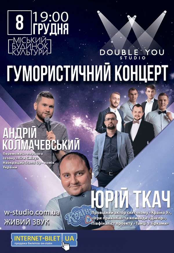 Гумористичний концерт студії "DoubleYou" відбудеться 8.12.2017 в МБК за допомоги сервісу internet-bilet.ua, Ви зможете з легкістю забронювати, замовити квитки на цікавий для вас концерт, спектакль, оперу, балет, майстер-класи, спортивні та дитячі заходи, сплативши їх найзручнішим для Вас способом: через інтернет банківською карткою VISA/MasterCard, готівкою або кур'єром, якщо зробите замовлення квитка c доставкою