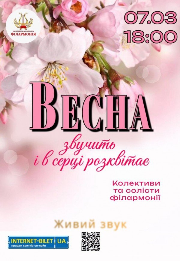 Концерт "Весна" відбудеться 7 березня 2025, 18:00, п’ятниця в Полтавська обласна філармонія. За допомогою сервісу internet-bilet.ua, Ви зможете з легкістю забронювати, замовити та купити квитки на концерт, спектакль, оперу, балет, майстер-класи, спортивні та дитячі заходи, що Вас цікавлять, оплативши їх найбільш зручним для Вас способом: через інтернет банківською карткою VISA/MasterCard, готівкою або кур'єром, якщо зробите замовлення квитка з доставкою.