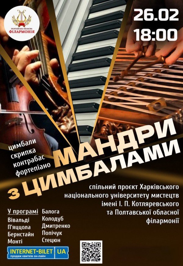 Концерт "Мандри з цимбалами" відбудеться 26 лютого 2025, 18:00, середа в Полтавська обласна філармонія. За допомогою сервісу internet-bilet.ua, Ви зможете з легкістю забронювати, замовити та купити квитки на концерт, спектакль, оперу, балет, майстер-класи, спортивні та дитячі заходи, що Вас цікавлять, оплативши їх найбільш зручним для Вас способом: через інтернет банківською карткою VISA/MasterCard, готівкою або кур'єром, якщо зробите замовлення квитка з доставкою.