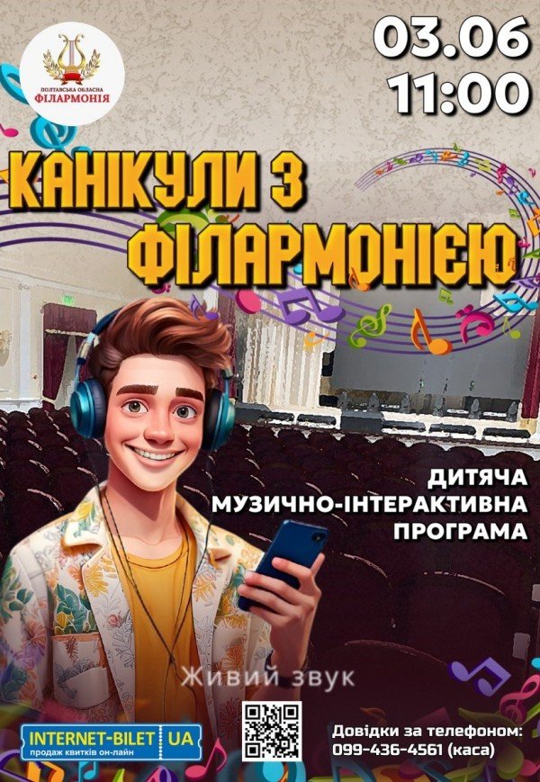 Канікули з філармонією відбудеться 3 червня 2025, 11:00, вівторок в Полтавська обласна філармонія. За допомогою сервісу internet-bilet.ua, Ви зможете з легкістю забронювати, замовити та купити квитки на концерт, спектакль, оперу, балет, майстер-класи, спортивні та дитячі заходи, що Вас цікавлять, оплативши їх найбільш зручним для Вас способом: через інтернет банківською карткою VISA/MasterCard, готівкою або кур'єром, якщо зробите замовлення квитка з доставкою.