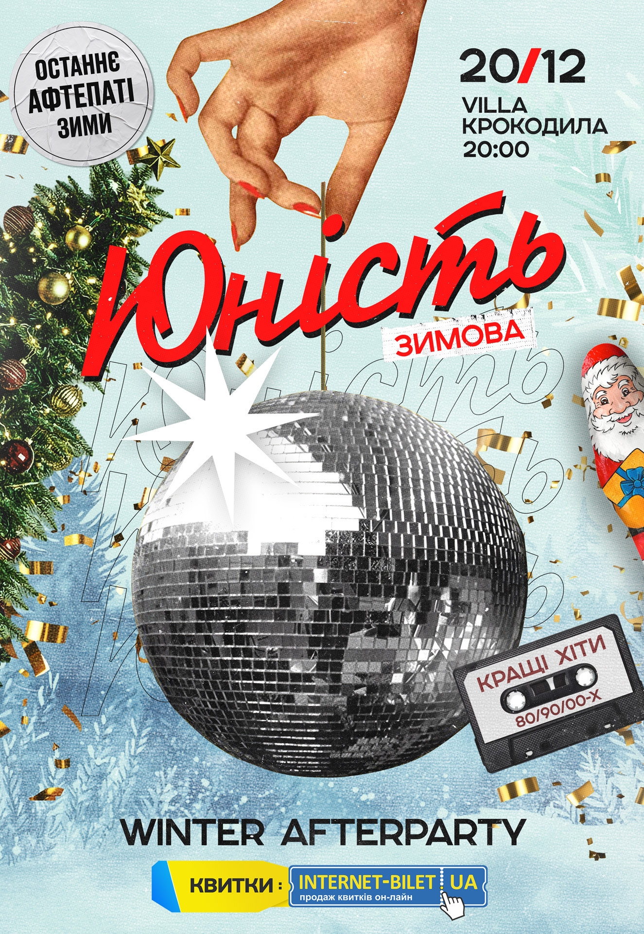 Вечірка "Юність. Winter Afterparty" відбудеться 20 грудня 2025, 20:00, субота в Concert hall «Villa Крокодила». За допомогою сервісу internet-bilet.ua, Ви зможете з легкістю забронювати, замовити та купити квитки на концерт, спектакль, оперу, балет, майстер-класи, спортивні та дитячі заходи, що Вас цікавлять, оплативши їх найбільш зручним для Вас способом: через інтернет банківською карткою VISA/MasterCard, готівкою або кур'єром, якщо зробите замовлення квитка з доставкою.