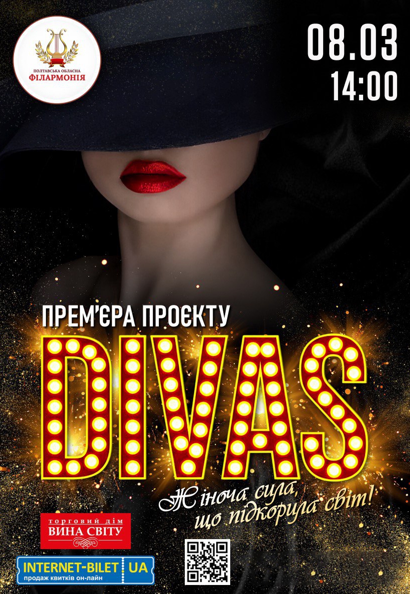 Концерт "DIVAS". Прем'єра! відбудеться 8 березня 2026, 14:00, неділя в Полтавська обласна філармонія. За допомогою сервісу internet-bilet.ua, Ви зможете з легкістю забронювати, замовити та купити квитки на концерт, спектакль, оперу, балет, майстер-класи, спортивні та дитячі заходи, що Вас цікавлять, оплативши їх найбільш зручним для Вас способом: через інтернет банківською карткою VISA/MasterCard, готівкою або кур'єром, якщо зробите замовлення квитка з доставкою.