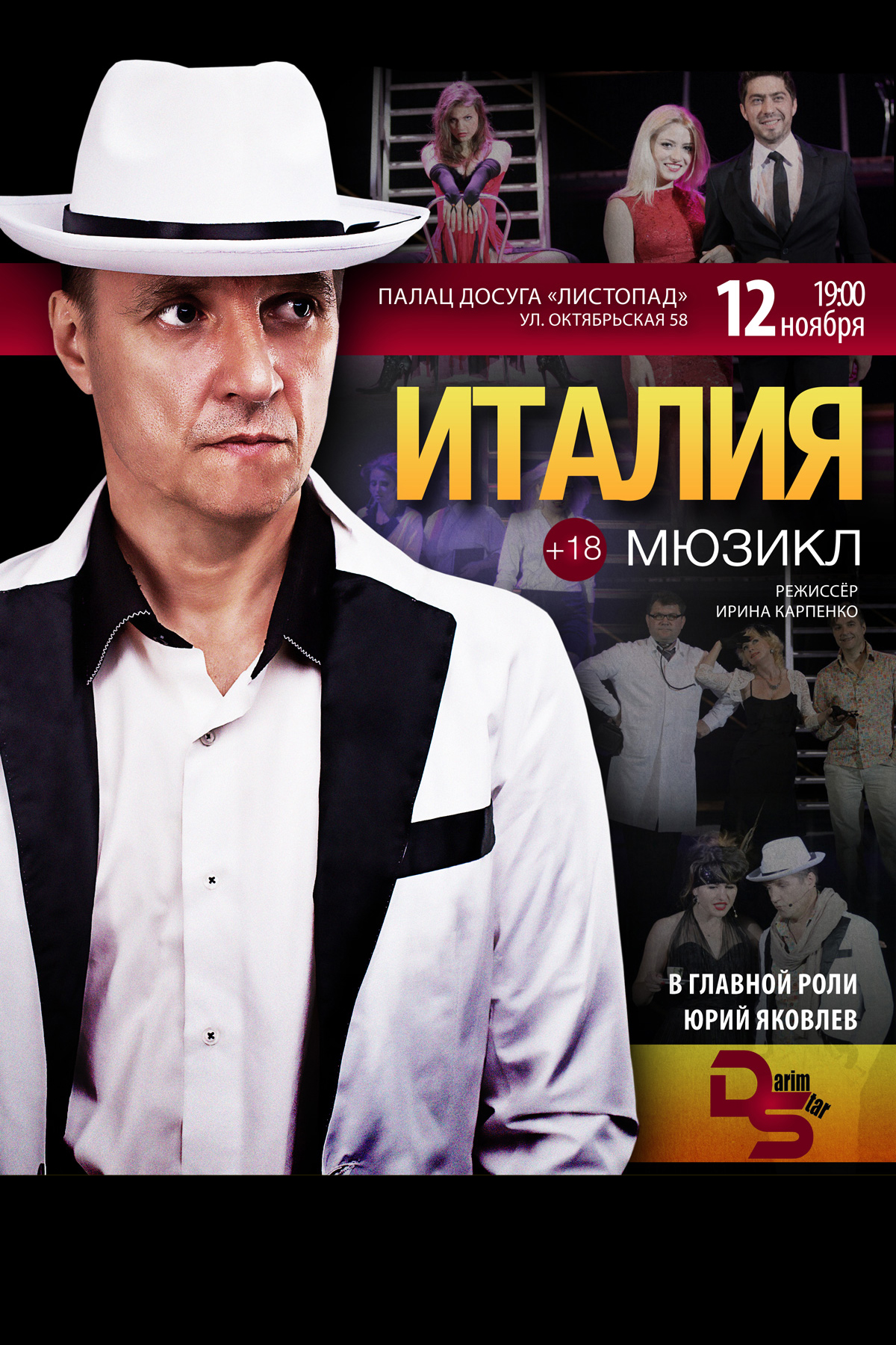 Мюзикл "Италия" відбудеться 12 листопада 2015, 19:00, четвер в Палац дозвілля "Листопад". За допомогою сервісу internet-bilet.ua, Ви зможете з легкістю забронювати, замовити та купити квитки на концерт, спектакль, оперу, балет, майстер-класи, спортивні та дитячі заходи, що Вас цікавлять, оплативши їх найбільш зручним для Вас способом: через інтернет банківською карткою VISA/MasterCard, готівкою або кур'єром, якщо зробите замовлення квитка з доставкою.