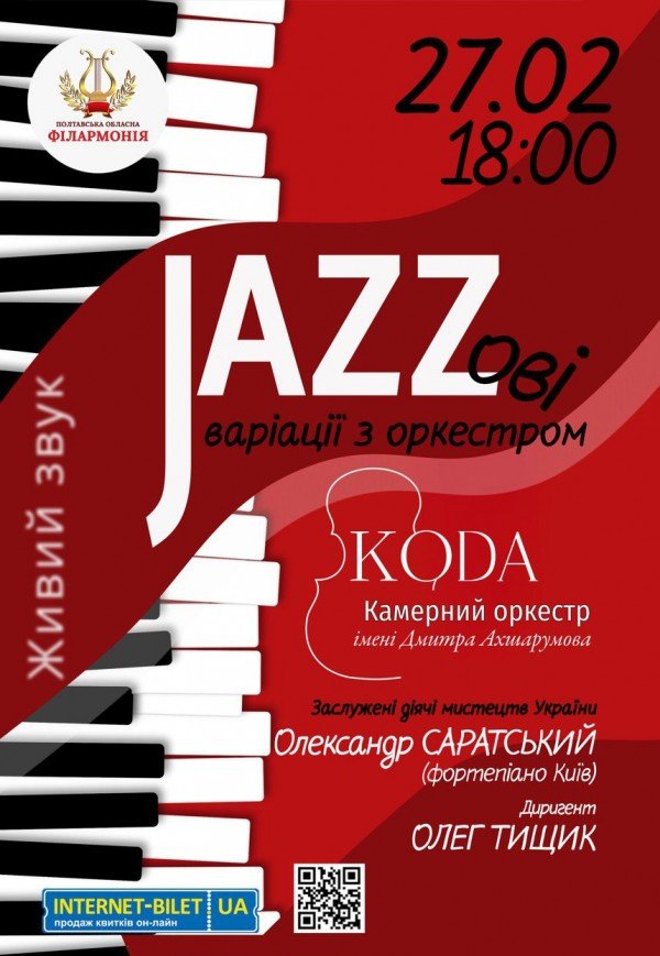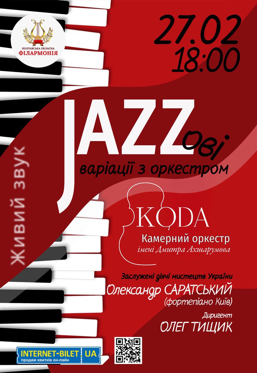 Концерт "JAZZові варіації з оркестром" відбудеться 27 лютого 2026, 18:00, п’ятниця в Полтавська обласна філармонія. За допомогою сервісу internet-bilet.ua, Ви зможете з легкістю забронювати, замовити та купити квитки на концерт, спектакль, оперу, балет, майстер-класи, спортивні та дитячі заходи, що Вас цікавлять, оплативши їх найбільш зручним для Вас способом: через інтернет банківською карткою VISA/MasterCard, готівкою або кур'єром, якщо зробите замовлення квитка з доставкою.