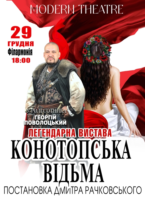 "Конотопська відьма" - гучна прем'єра вистави MODERN THEATRE за однойменною сатирично-фантастичною повістю Григорія Квітки-Основ’яненко у постановці Дмитра Рачковського. "… А хто він, той сотник Забрьоха? Так він дурень. Конотопський? Ні, справжній… А Пістряк? Чорт… Теж справжній? А хто його зна… Хіба що відьма…"