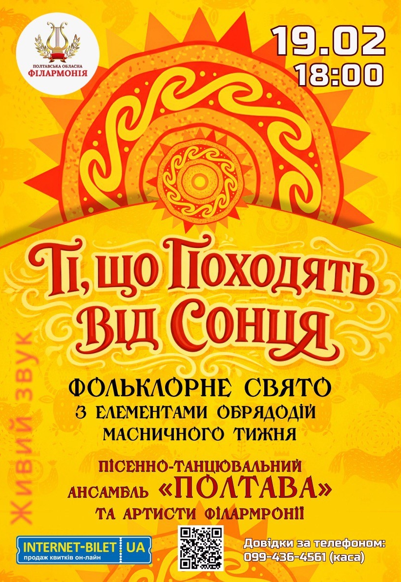 Концерт "Ті, що походять від Сонця" відбудеться 19 лютого 2026, 18:00, четвер в Полтавська обласна філармонія. За допомогою сервісу internet-bilet.ua, Ви зможете з легкістю забронювати, замовити та купити квитки на концерт, спектакль, оперу, балет, майстер-класи, спортивні та дитячі заходи, що Вас цікавлять, оплативши їх найбільш зручним для Вас способом: через інтернет банківською карткою VISA/MasterCard, готівкою або кур'єром, якщо зробите замовлення квитка з доставкою.