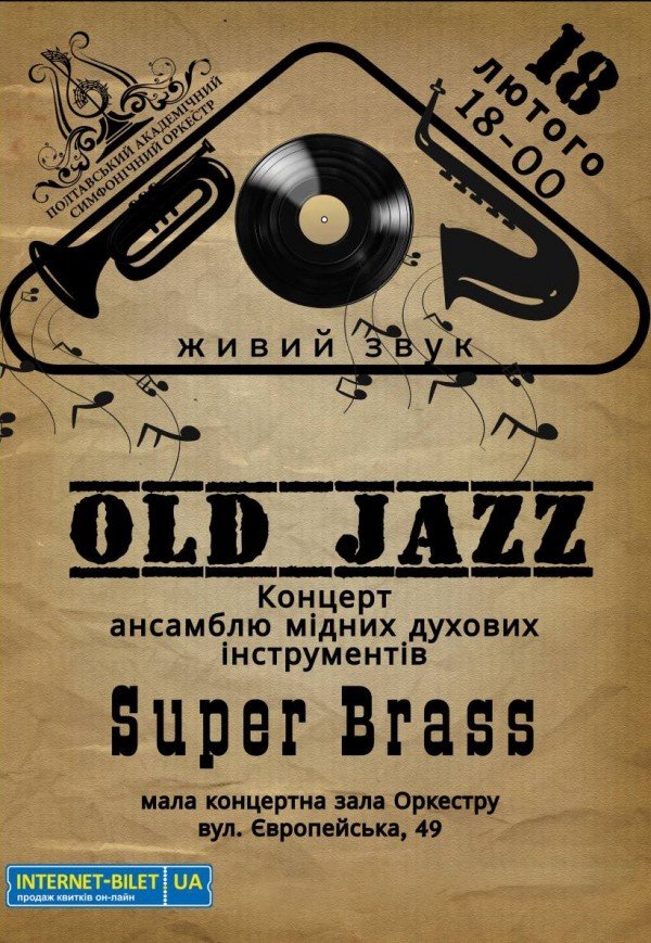 Концерт "Super brass" відбудеться 18 лютого 2026, 18:00, середа в Концертний зал Полтавського симфонічного оркестру. За допомогою сервісу internet-bilet.ua, Ви зможете з легкістю забронювати, замовити та купити квитки на концерт, спектакль, оперу, балет, майстер-класи, спортивні та дитячі заходи, що Вас цікавлять, оплативши їх найбільш зручним для Вас способом: через інтернет банківською карткою VISA/MasterCard, готівкою або кур'єром, якщо зробите замовлення квитка з доставкою.