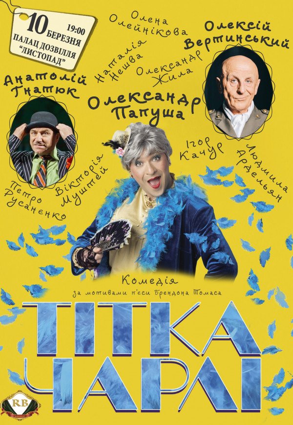 Вистава "Тітонька Чарлі" відбудеться 10 березня 2020, 19:00, вівторок в Палац дозвілля "Листопад". За допомогою сервісу internet-bilet.ua, Ви зможете з легкістю забронювати, замовити та купити квитки на концерт, спектакль, оперу, балет, майстер-класи, спортивні та дитячі заходи, що Вас цікавлять, оплативши їх найбільш зручним для Вас способом: через інтернет банківською карткою VISA/MasterCard, готівкою або кур'єром, якщо зробите замовлення квитка з доставкою.