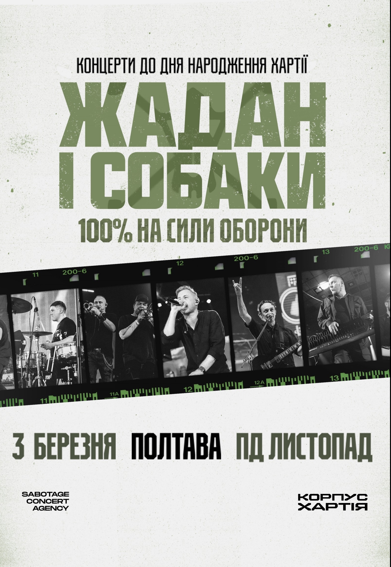 Дорогі брати і сестри, раді вам повідомити, що Жадан і Собаки зіграють концерт у Полтаві в межах «Хартія туру»! Цієї весни «Хартія» святкує 4 річницю з дня створення, з цієї нагоди, ми хочемо зустрітися з вами 3 березня в Палац дозвілля "Листопад". Пригадуйте слова улюблених «Мальв» і «Натахи».